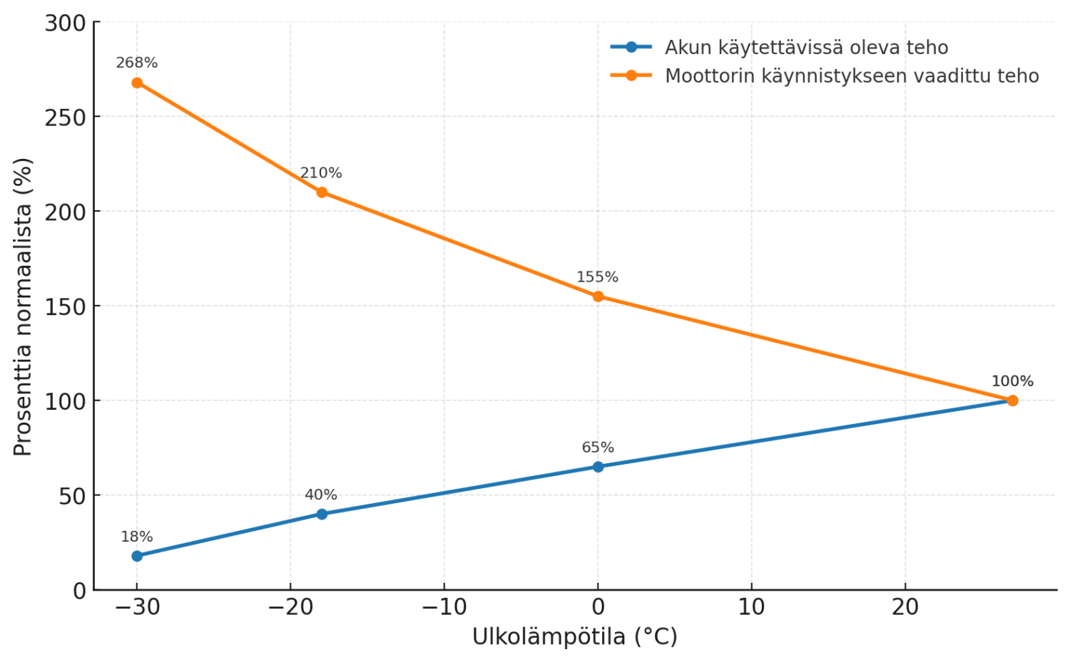 Suomen talvi on auton akun todellinen koetinkivi. Kylmä sää hidastaa akun kemiallisia reaktioita ja voi heikentää käynnistystehoa jopa 35 %. Samalla auton sähkönkulutus kasvaa, kun käytössä ovat penkin- ja ikkunanlämmittimet, takalasin lämmitin, valot ja mahdollinen polttoainekäyttöinen lisälämmitin. Jos akku on jo ikääntynyt, tämä voi olla ratkaiseva tekijä, joka jättää auton käynnistymättä.