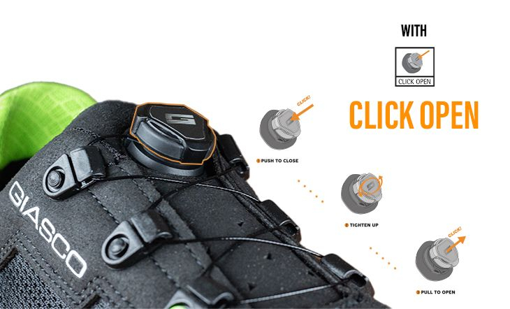 Click Open -järjestelmässä käytetään ruostumattomasta teräksestä valmistettua vaijeria, joka peittää jalkapöydän ja jakaa kiristyksen tasaisesti. Mekanismissa on muistiominaisuus, joka estää nauhojen löystymisen käytössä.