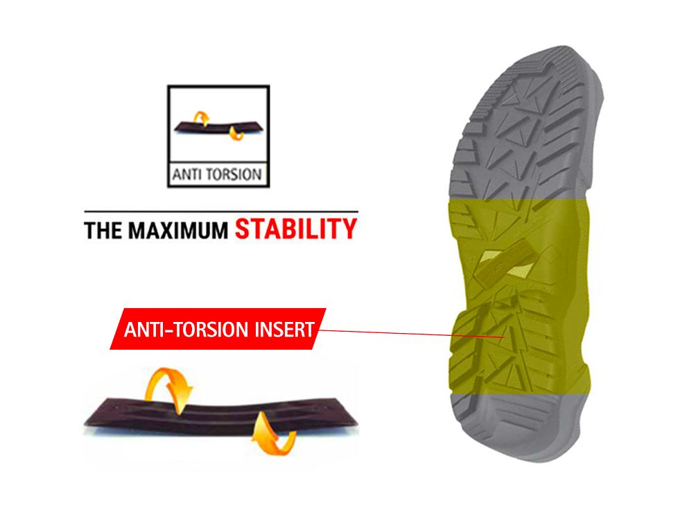 - Antitorsion-vahvike – Tukee jalkaa epätasaisilla alustoilla ja parantaa tasapainoa.