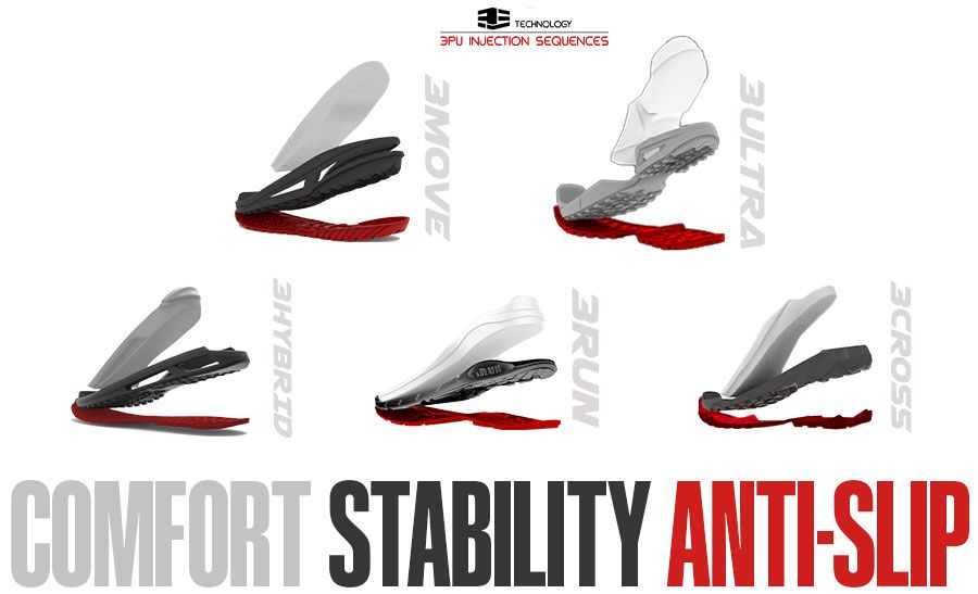 3D-teknologia on maailman ensimmäinen ja ainoa täysin injektoitu kolmikerroksinen polyuretaanipohja, joka tarjoaa maksimaalisen mukavuuden ja pehmeyden säilyttäen samalla injektoitujen kenkien tunnetut edut – erinomaisen kestävyyden ja suojan.