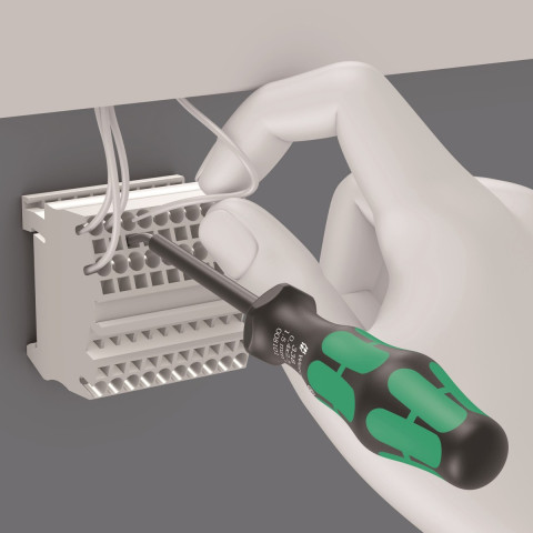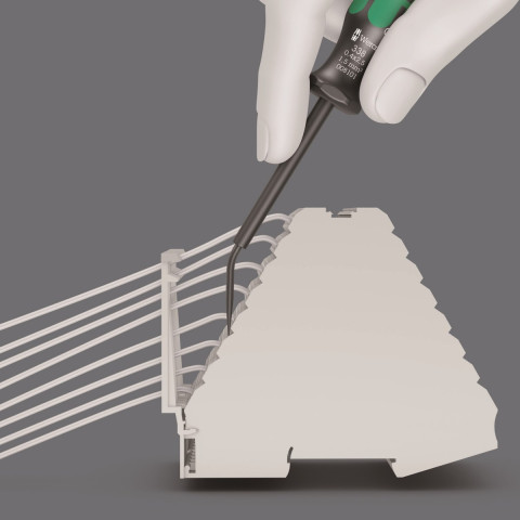 Kätevä jousiliittimien avaustyökalu. Taivutetun terän ansiosta työkalulla voidaan käsitellä hyvin myös jakokeskusten jousiliittimiä, joihin ei pääse käsiksi suoralla terällä. Terä pysyy kiinni liittimessä, jolloin molemmat kädet jäävät vapaiksi kaapelin sisään asettamista varten. Kraftform-monikomponenttikahva nopeaan ja miellyttävään työskentelyyn.